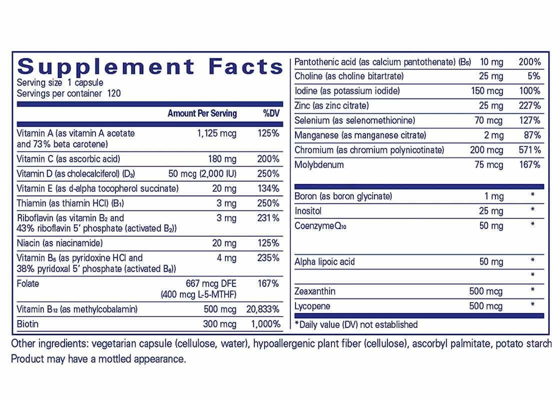 Πολυβιταμίνες για γυναίκες και άνδρες: Οι κάψουλες που λαμβάνονται μία φορά την ημέρα παρέχουν βιταμίνες Α, Β, Γ, D και Ε σε πολύ βιοδιαθέσιμες μορφές· CoQ10, L-5-MTHF και ALA για αντιοξειδωτική υποστήριξη.